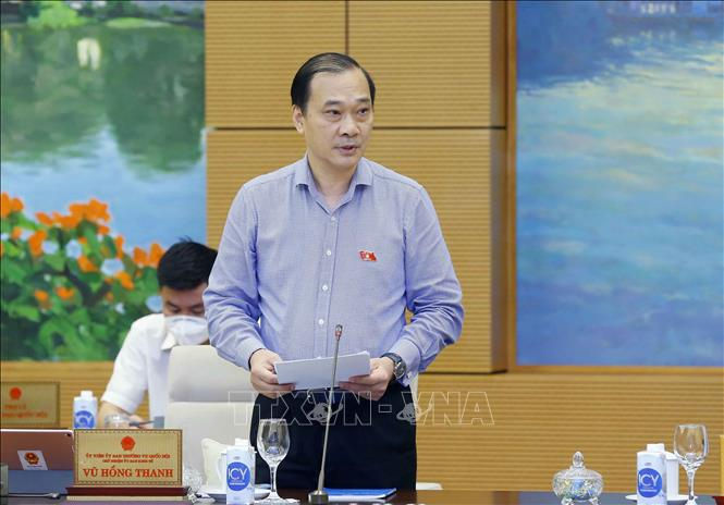 Chủ nhiệm Ủy ban Kinh tế của Quốc hội Vũ Hồng Thanh, Phó Trưởng đoàn Thường trực Đoàn giám sát trình bày các văn bản liên quan. Ảnh: Doãn Tấn/TTXVN