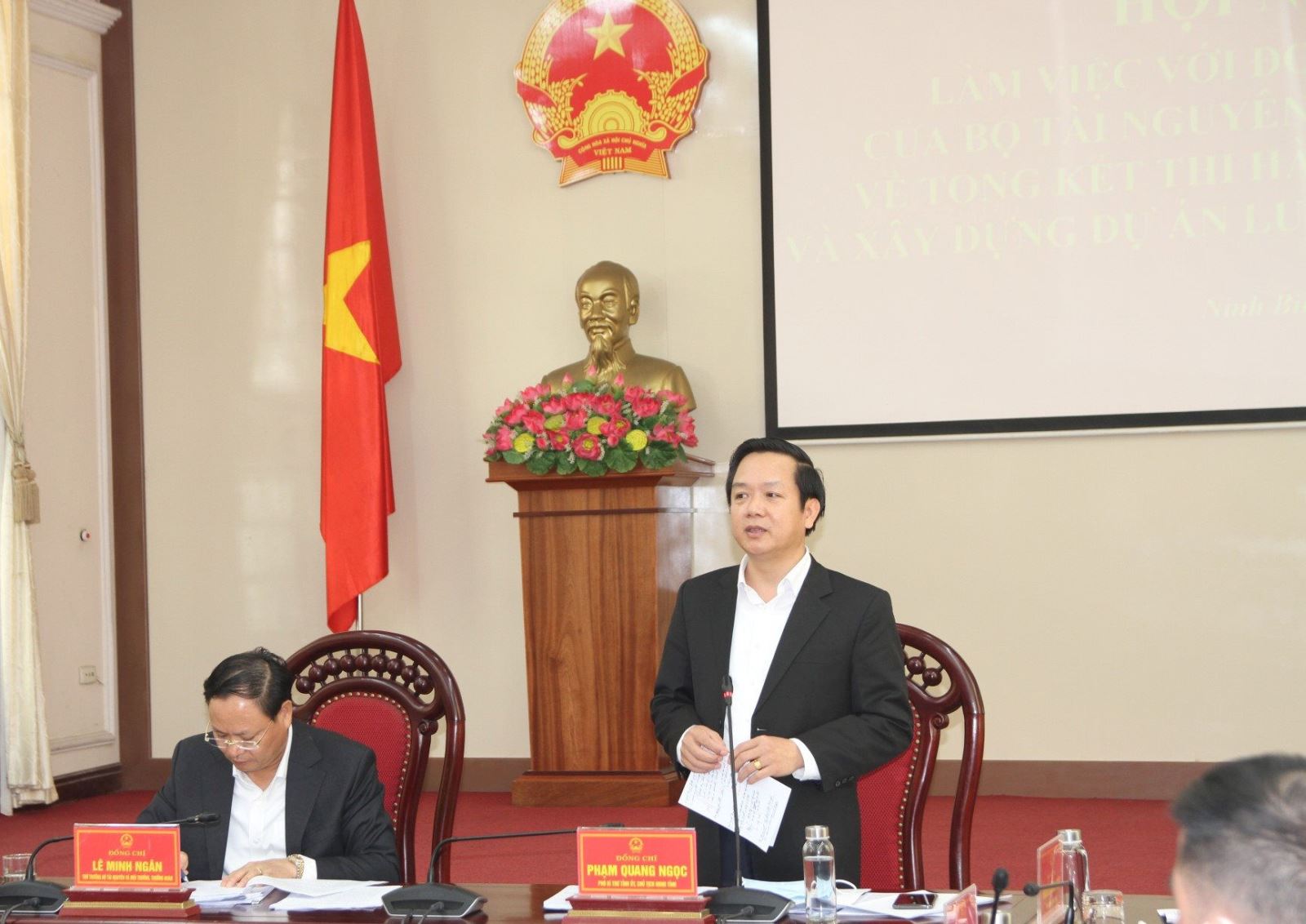 Phát biểu tại buổi làm việc, Chủ tịch UBND tỉnh Phạm Quang Ngọc cảm ơn sự quan tâm, hỗ trợ của Bộ TN&MT, các bộ ngành trung ương đã dành cho tỉnh Ninh Bình trong những giai đoạn vừa qua để địa phương phát triển theo hướng kinh tế xanh, phát triển bền vững. Đồng thời, đề nghị Bộ tiếp tục tạo điều kiện, giải quyết kịp thời những kiến nghị, đề xuất của tỉnh; tiếp tục rà soát, tham mưu Chính phủ sớm sửa đổi những vướng mắc, bất cập của Luật Đất đai và các văn bản hướng dẫn của Bộ về vấn đề này.